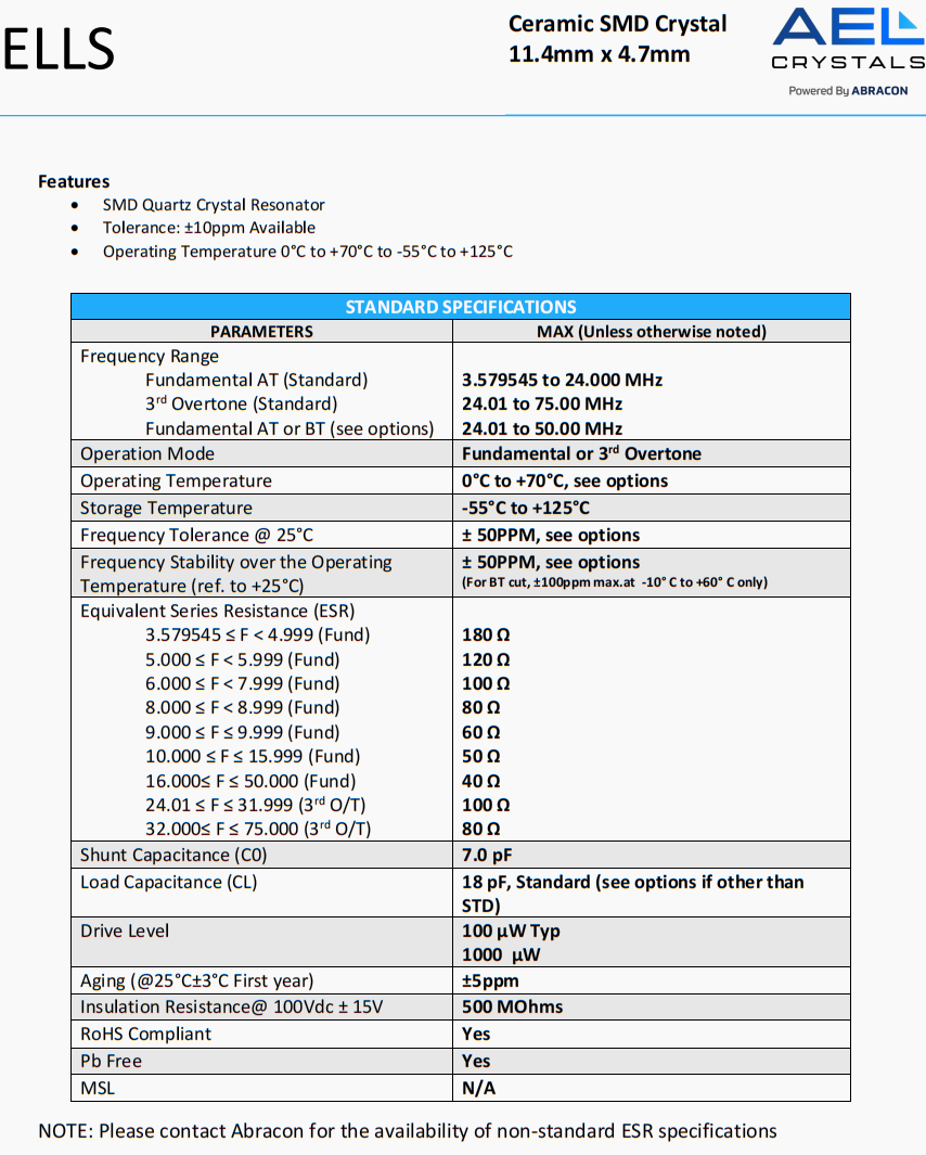 | ELLS-12.000MHz-18-R60-A-4-F-T | AEL Crystals | ELLS | 12 MHz | ±50ppm | ±30ppm | 18 pF |