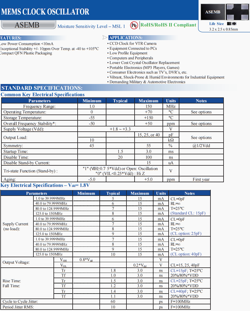 | ASEMB-8.000MHZ-XY-T | Abracon晶振 | ASEMB | XO | 8 MHz | 1.8V ~ 3.3V | ±10ppm |
