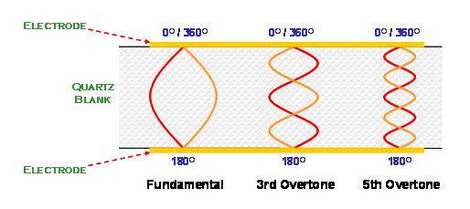 在AT切割角度的石英晶體共振子主要是以厚度剪切振蕩模態(tài)存在. "CM315-32.768KDZY-UT",石英晶體在共振時, 除了基本波振蕩之外, 高階的倍頻共振也與基本波振蕩同時存在于石英晶體的電極區(qū)域之間. 但是, 由于壓電材料的電極是電氣相位相反的振動環(huán)境, 所以, 祇有奇數倍(odd number)的高頻倍頻可以發(fā)生, 偶數倍(even number)的倍頻共振在石英晶體共振子是不會存在的(圖).