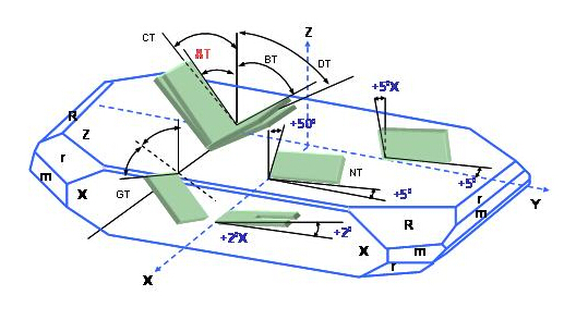 依據(jù)不同的應(yīng)用領(lǐng)域及工作溫度需求, 因應(yīng)了許多不同的石英切割角度種類. 例如AT-, BT-, CT-, DT-, NT, GT…..等不同的切割板片. 不同的切割方向的板片具有不同的彈性常數(shù)張量(elastic constant tensor), 不同的壓電常數(shù)張量(piezoelectric constant tensor)及不同的介電常數(shù)張量(dielectric constant tensor). 這些張量在石英組件的設(shè)計(jì)及應(yīng)用上展現(xiàn)了不同的振蕩及溫度特性. (圖中)表現(xiàn)了在Z-plat石英結(jié)構(gòu)上,幾種不同方向的石英板片切割方式.