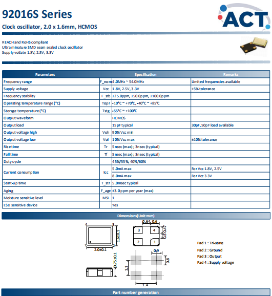 ACT晶振,92016S晶振,時鐘晶體振蕩器.貼片石英晶振,體積小,焊接可采用自動貼片系統(tǒng),產(chǎn)品本身小型,表面貼片晶振,特別適用于有小型化要求的電子數(shù)碼產(chǎn)品市場領(lǐng)域,因產(chǎn)品小型,薄型優(yōu)勢,耐環(huán)境特性,包括耐高溫,耐沖擊性等,在移動通信領(lǐng)域得到了廣泛的應(yīng)用,晶振產(chǎn)品本身可發(fā)揮優(yōu)良的電氣特性,滿足無鉛焊接的高溫回流溫度曲線要求.