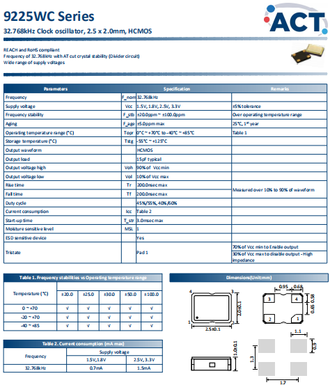 ACT晶振,9225WC晶振,有源晶體振蕩器.貼片晶振本身體積小,超薄型石英晶體振蕩器,特別適用于有目前高速發展的高端電子數碼產品,因為晶振本身小型化需求的市場領域,小型,薄型是對應陶瓷振蕩器(偏差大)和普通的石英晶體振蕩器(偏差小)的中間領域的一種性價比較出色的產品.產品廣泛用于筆記本電腦,無線電話,衛星導航HDD, SSD, USB, Blu-ray等用途,符合無鉛焊接的高溫回流焊曲線特性.