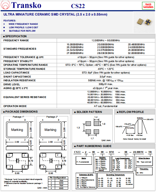 Transko晶振,CS22晶振,進(jìn)口貼片晶振.小型貼片石英晶振,外觀尺寸具有薄型表面貼片型石英晶體諧振器,特別適用于有小型化要求的市場領(lǐng)域,比如智能手機(jī),無線藍(lán)牙,平板電腦等電子數(shù)碼產(chǎn)品.晶振本身超小型,薄型,重量輕,晶體具有優(yōu)良的耐環(huán)境特性,如耐熱性,耐沖擊性,在辦公自動化,家電相關(guān)電器領(lǐng)域及Bluetooth,Wireless LAN等短距離無線通信領(lǐng)域可發(fā)揮優(yōu)良的電氣特性,滿足無鉛焊接的回流溫度曲線要求.