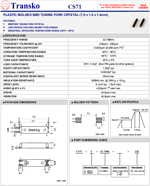Transko晶振,CS71晶振,音叉水晶振子.小型貼片石英晶振,外觀尺寸具有薄型表面貼片型石英晶體諧振器,特別適用于有小型化要求的市場領(lǐng)域,比如智能手機,無線藍(lán)牙,平板電腦等電子數(shù)碼產(chǎn)品.晶振本身超小型,薄型,重量輕,晶體具有優(yōu)良的耐環(huán)境特性,如耐熱性,耐沖擊性,在辦公自動化,家電相關(guān)電器領(lǐng)域及Bluetooth,Wireless LAN等短距離無線通信領(lǐng)域可發(fā)揮優(yōu)良的電氣特性,滿足無鉛焊接的回流溫度曲線要求.
