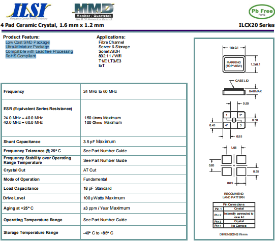 ILSI晶振,ILCX20晶振,高性能石英晶體.小型表面貼片晶振型,是標準的石英晶體諧振器,適用于寬溫范圍的電子數碼產品,家電電器及MP3,MP4,播放器,單片機等領域.可對應24.000MHz以上的頻率,在電子數碼產品,以及家電相關電器領域里面發(fā)揮優(yōu)良的電氣特性,滿足無鉛焊接的回流溫度曲線要求.