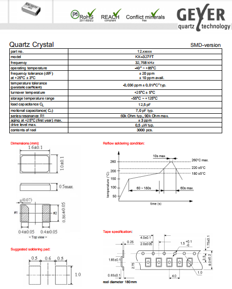 Geyer晶振,KX-327FT晶振,石英晶體諧振器.小體積SMD時(shí)鐘晶體諧振器,是貼片音叉晶體,千赫頻率元件,應(yīng)用于時(shí)鐘模塊,智能手機(jī),全球定位系統(tǒng),因產(chǎn)品本身體積小,SMD編帶型,可應(yīng)用于高性能自動(dòng)貼片焊接,被廣泛應(yīng)用到各種小巧的便攜式消費(fèi)電子數(shù)碼時(shí)間產(chǎn)品,環(huán)保性能符合ROHS/無(wú)鉛標(biāo)準(zhǔn).