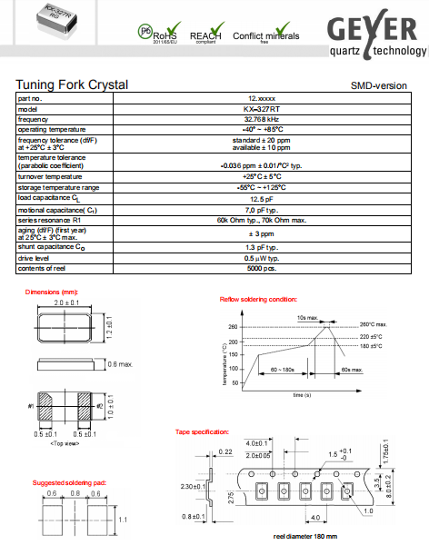 Geyer晶振,KX-327RT晶振,無源環保晶振.小體積SMD時鐘石英晶體諧振器,是貼片音叉晶體,千赫頻率元件,應用于時鐘模塊,智能手機,全球定位系統,因產品本身體積小,SMD編帶型,可應用于高性能自動貼片焊接,被廣泛應用到各種小巧的便攜式消費電子數碼時間產品,環保性能符合ROHS/無鉛標準.