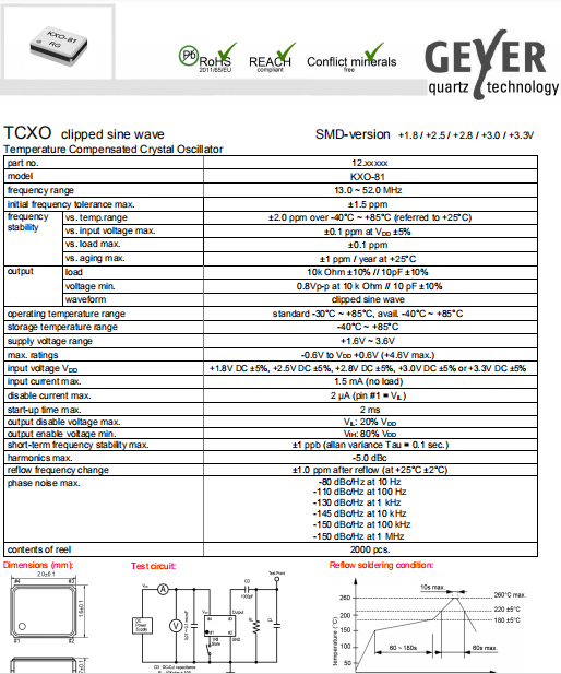Geyer晶振,KXO-81晶振,溫補(bǔ)晶振.小型SMD有源晶振,從最初超大體積到,有著翻天覆地的改變,體積的變小也使產(chǎn)品帶來(lái)了更高的穩(wěn)定性能,接縫密封石英晶體振蕩器,精度高,覆蓋頻率范圍寬的特點(diǎn),SMD高速自動(dòng)安裝和高溫回流焊設(shè)計(jì),Optionable待機(jī)輸出三態(tài)輸出功能,電源電壓范圍:1.8~5 V,高穩(wěn)定性,低抖動(dòng),低功耗,主要應(yīng)用領(lǐng)域:無(wú)線通訊,高端智能手機(jī),平板筆記本W(wǎng)LAN,藍(lán)牙,數(shù)碼相機(jī),DSL和其他IT產(chǎn)品的晶振應(yīng)用,三態(tài)功能,PC和LCDM等高端數(shù)碼領(lǐng)域,符合RoHS/無(wú)鉛.
