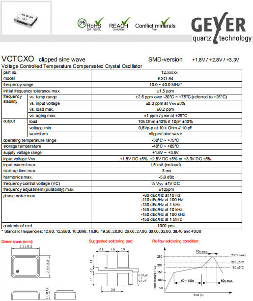 Geyer晶振,KXO-84晶振,壓控溫補(bǔ)晶振.有源晶振,是只晶體本身起振需要外部電壓供應(yīng),起振后可直接驅(qū)動(dòng)CMOS 集成電路,產(chǎn)品本身已實(shí)現(xiàn)與薄型IC(TSSOP封裝,TVSOP封裝)同樣的1mm厚度,斷開時(shí)的消費(fèi)電流是15 µA以下,編帶包裝方式可對(duì)應(yīng)自動(dòng)搭載及IR回流焊接(無(wú)鉛對(duì)應(yīng))產(chǎn)品有幾種電壓供選1.8V,2.5V,3V3.3V,5V,以應(yīng)對(duì)不同IC產(chǎn)品需要.