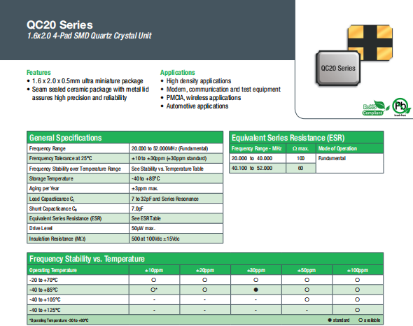 Qantek晶振,QC20晶振,貼片無源晶振.貼片晶振本身體積小,超薄型石英晶體諧振器,特別適用于有目前高速發展的高端電子數碼產品,因為晶振本身小型化需求的市場領域,小型,薄型是對應陶瓷諧振器(偏差大)和普通的石英晶體諧振器(偏差小)的中間領域的一種性價比較出色的產品.產品廣泛用于筆記本電腦,無線電話,衛星導航HDD,SSD,USB,Blu-ray等用途,符合無鉛焊接的高溫回流焊曲線特性.