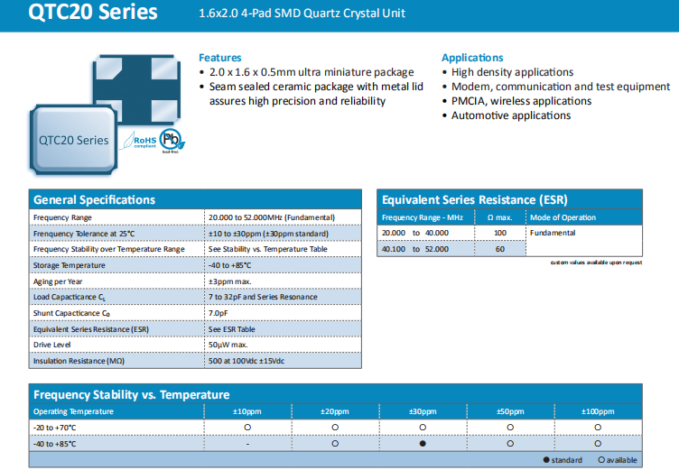 | 頻率溫度特征 | f_tem | ±50× 10-6 /-30°C~+85°C | 超出標(biāo)準(zhǔn)的規(guī)格請(qǐng)聯(lián)系我們. |