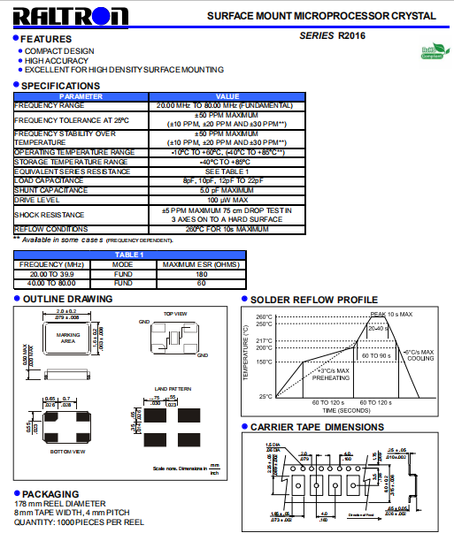 Raltron晶振,R2016晶振,石英晶體諧振器.貼片石英晶體,體積小,焊接可采用自動貼片系統(tǒng),產(chǎn)品本身小型,表面貼片晶振,特別適用于有小型化要求的電子數(shù)碼產(chǎn)品市場領(lǐng)域,因產(chǎn)品小型,薄型優(yōu)勢,耐環(huán)境特性,包括耐高溫,耐沖擊性等,在移動通信領(lǐng)域得到了廣泛的應(yīng)用,晶振產(chǎn)品本身可發(fā)揮優(yōu)良的電氣特性,滿足無鉛焊接的高溫回流溫度曲線要求.
