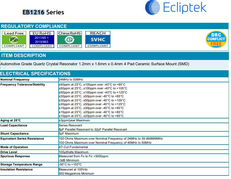 | EB1216JA10-24.000M TR | Ecliptek | EB1216 | MHz 晶體 | 24 MHz | ±30ppm | ±15ppm | 10pF |