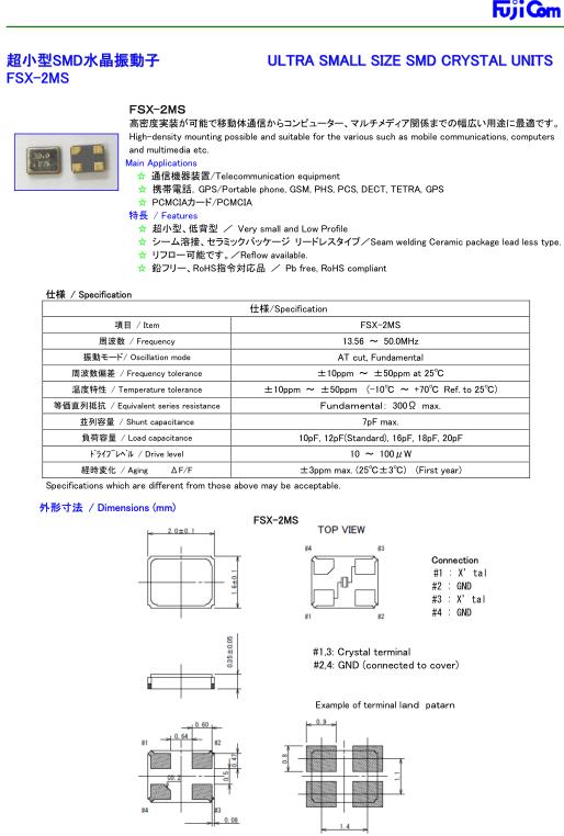 fujicom富士通晶振,FSX-2M無源晶振,攜帶電話晶振,小型貼片石英晶振,外觀尺寸具有薄型表面貼片型石英晶體振蕩器,特別適用于有小型化要求的市場領(lǐng)域,比如智能手機(jī),無線藍(lán)牙,平板電腦等電子數(shù)碼產(chǎn)品.晶振本身超小型,薄型,重量輕,晶體具有優(yōu)良的耐環(huán)境特性,如耐熱性,耐沖擊性,在辦公自動(dòng)化,家電相關(guān)電器領(lǐng)域及Bluetooth,WirelessLAN等短距離無線通信領(lǐng)域可發(fā)揮優(yōu)良的電氣特性,滿足無鉛焊接的回流溫度曲線要求.