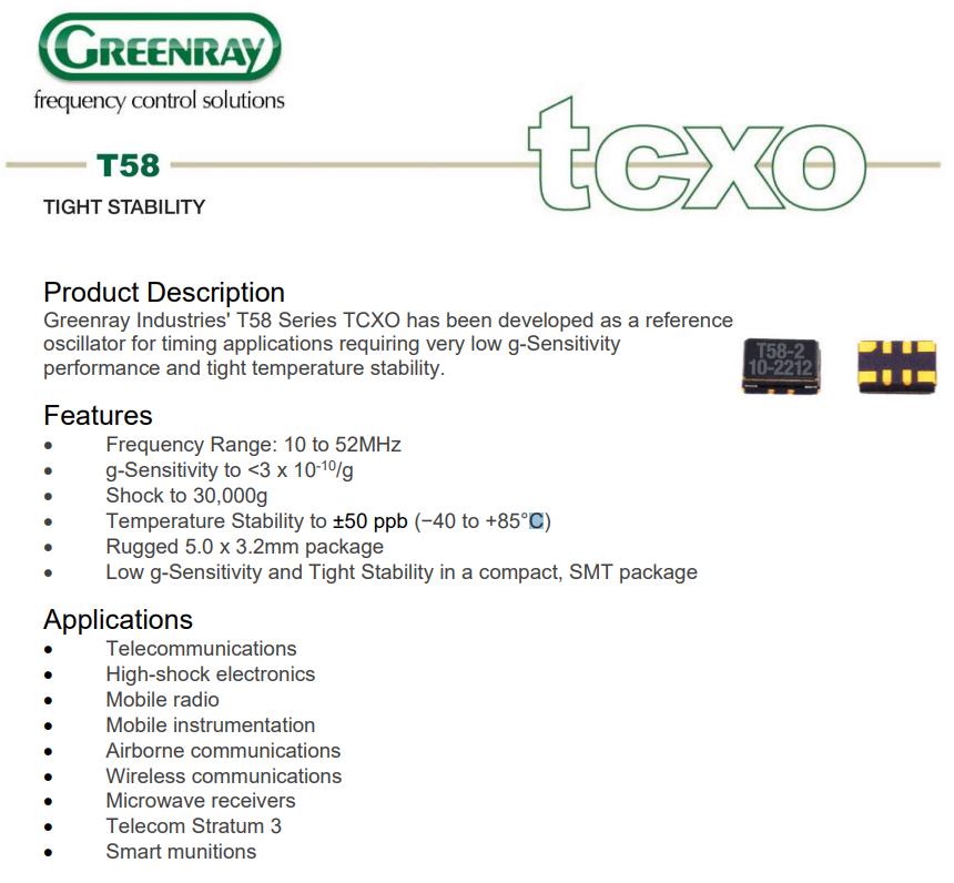 T58-T58-C-LG-48.0MHz-E,TCXO晶振,6G移動無線電晶振,格林雷晶振,T58石英晶體振蕩器,T58-T58-C-LG-48.0MHz-E晶振,5032mm晶振,進(jìn)口貼片晶振,TCXO晶振,頻率48MHz,電壓3.3V,工作溫度-40~85°C,抗沖擊晶振,高穩(wěn)定性晶振,6G移動無線電晶振,高沖擊電子設(shè)備晶振,機載通信晶振,智能彈藥晶振.