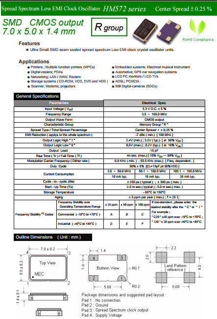 MERCURY晶振,臺(tái)產(chǎn)有源晶振,HM572R時(shí)鐘晶體振蕩器.貼片式石英晶體振蕩器,低電壓啟動(dòng)功率,并且有多種電壓供選擇,比如有1.8V,2.5V,3.3V,3.8V,5V等,產(chǎn)品被廣泛應(yīng)用于,平板筆記本,GPS系統(tǒng),光纖通道,千兆以太網(wǎng),串行ATA,串行連接SCSI,PCI-Express的SDH / SONET發(fā)射基站等領(lǐng)域.符合RoHS/無鉛.