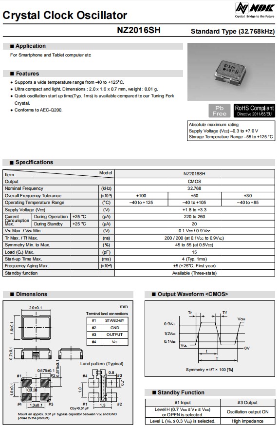 NZ2016SH-24.000MHZNSC5022C平板電腦晶振,NDK晶體振蕩器,日本NDK晶振,進口晶振,NZ2016SH型號是一款小體積晶振尺寸2.0x1.6x0.7mm四腳貼片晶振,32.768KHz晶振,石英晶體振蕩器,有源晶振,無鉛環(huán)保晶振,支持寬溫度范圍從-40°C到+125°C,超緊湊和輕,重量:0.01g,快速振蕩啟動時間(類型,1ms)是可用的相比,符合AEC-Q200,電源電壓(VCC)-0.3至+7.0 V,石英晶體振蕩器具有超小型,輕薄型,耐熱及耐環(huán)境特點,適用于智能手機,平板電腦,鐘表電子,無線網(wǎng)絡(luò),藍牙模塊,可穿戴設(shè)備,汽車電子,醫(yī)療設(shè)備,物聯(lián)網(wǎng)應(yīng)用等