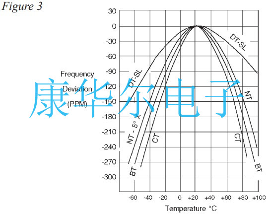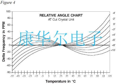 在各種元素中,貼片石英晶振的“AT”切割成了最受歡迎的,因?yàn)樗窍鄬?duì)較高的頻率,表現(xiàn)出優(yōu)異的頻率與溫度穩(wěn)定性并且以合理的成本廣泛獲得.該“AT”切割的頻率與溫度能力晶體單元如圖4所示.