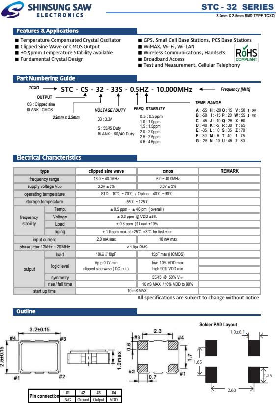 韓國新松晶振,STC-32溫度補償晶體振蕩器,STC-CS-32-33S-0.5HZ-16.000MHz晶振,小型SMD有源晶振,從最初超大體積到現在的7050mm,6035mm,5032mm,3225mm,2520mm體積,有著翻天覆地的改變,體積的變小也使產品帶來了更高的穩定性能,接縫密封石英晶體振蕩器,精度高,覆蓋頻率范圍寬的特點,SMD高速自動安裝和高溫回流焊設計,Optionable待機輸出三態輸出功能,電源電壓范圍:1.8V~5V,高穩定性,低抖動,低功耗,主要應用領域:無線通訊,高端智能手機,平板筆記本WLAN,藍牙,數碼相機,DSL和其他IT產品的晶振應用,三態功能,PC和LCDM等高端數碼領域,符合RoHS/無鉛.