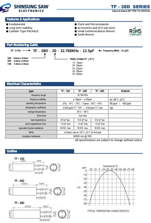 SHINSUNG晶振,TF-26D插件音叉晶體,TF-26D-15-32.768KHz-12.5pF晶振,SHINSUNG Crysta成立于1990年,并開始生產石英晶振,濾波器,石英晶體振蕩器,同時向客戶提供最新的新松貼片晶振或通孔型晶振單元,時鐘有源晶振,溫補晶振等晶振產品,一直以供應優質晶振產品為信念,不斷給社會創造價值.