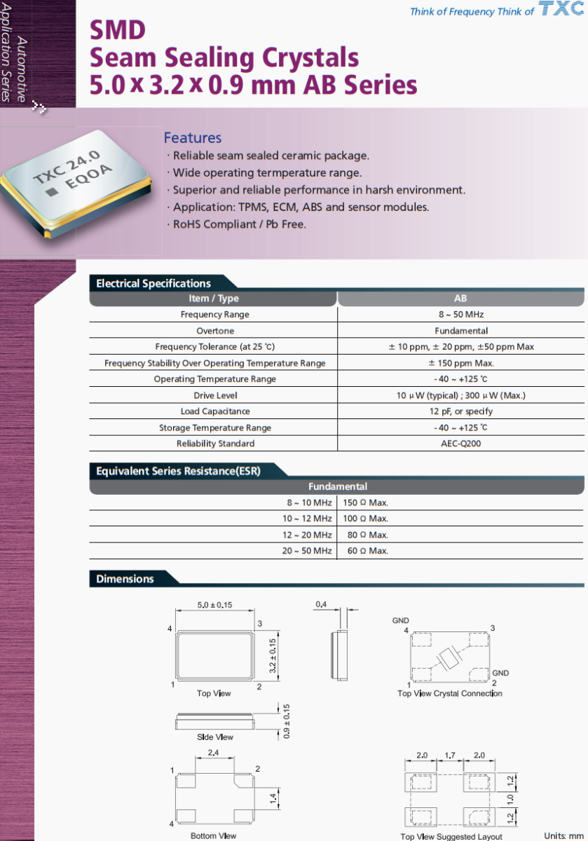 車載藍(lán)牙晶振,TXC無(wú)源晶振,AB-19.680MALE-T晶振,AB系列SMD,縫封晶體,5.0* 3.2* 0.9 mm ,特點(diǎn),可靠的縫封陶瓷封裝。工作溫度范圍寬。惡劣環(huán)境下性能優(yōu)越可靠。應(yīng)用范圍:TPMS, ECM, ABS,傳感器模塊。符合rohs標(biāo)準(zhǔn)/不含鉛臺(tái)灣TXC晶振公司,晶技晶振,無(wú)源晶振,5032晶振,AB-19.680MALE-T晶振,汽車晶振,汽車電動(dòng)天窗控制系統(tǒng)晶振,臺(tái)灣晶振,貼片晶振,四腳晶振,石英晶振,進(jìn)口晶振,高品質(zhì)晶振,車載多媒體晶振,行車記錄儀晶振,低損耗晶振,耐高溫晶振,耐沖擊晶振。