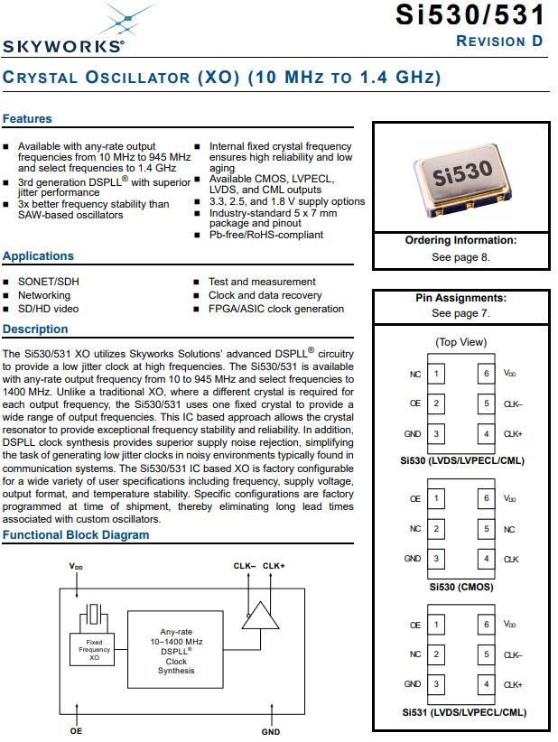 特性:可與任何速率輸出,頻率范圍為10mhz~945mhz,選擇頻率為1.4GHz,第三代DSPLL®,性能優(yōu)越抖動性能,頻率穩(wěn)定性優(yōu)于SAW-based有源晶體振蕩器,內(nèi)部固定晶頻,保證了高可靠性和低功耗老化,具備CMOS, LVPECL,LVDS和CML輸出,3.3、2.5、1.8 V供電選項,行業(yè)標(biāo)準(zhǔn)5 × 7mm封裝和引腳,Pb-free /通過無鉛認(rèn)證.