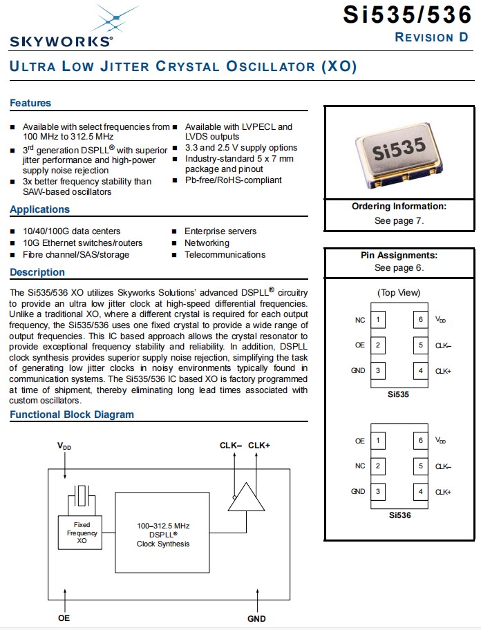 特點(diǎn):可選擇頻率從100兆赫到312.5兆赫,第三代DSPLL®具有優(yōu)越的抖動性能和高功率電源噪聲抑制,比基于saw的振蕩器好3倍的頻率穩(wěn)定性,可用LVPECL和LVDS輸出差分晶振,3.3和2.5V供應(yīng)選項,工業(yè)標(biāo)準(zhǔn)7.0x5.0毫米包和針形,無鉛/rohs兼容