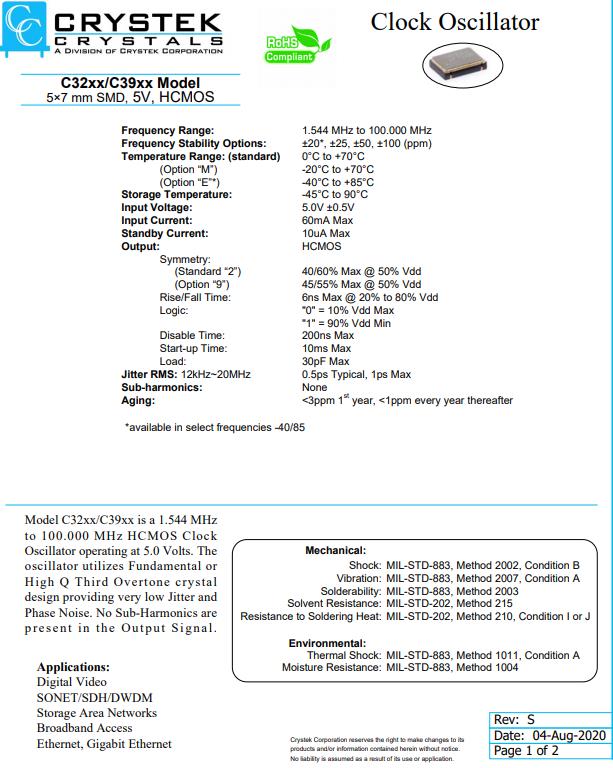 | CE3392-20.480 | CRYSTEK晶振 | C33 | XO (Standard) | 20.48MHz | ±50ppm | -40°C ~ 85°C |