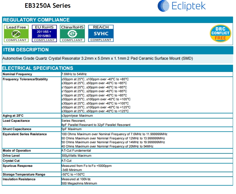 更多>>專屬于汽車電子控制板的Ecliptek高質量晶振編碼EB3250YA12-12.000M TR
