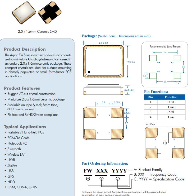 4-pad FW系列接縫密封裝置超微型at切割石英晶體諧振器一個標(biāo)準(zhǔn)的2.0 x 1.6毫米陶瓷封裝。這些致密晶體是表面安裝的理想選擇在人口密集或小形狀因素PCB應(yīng)用程序。
