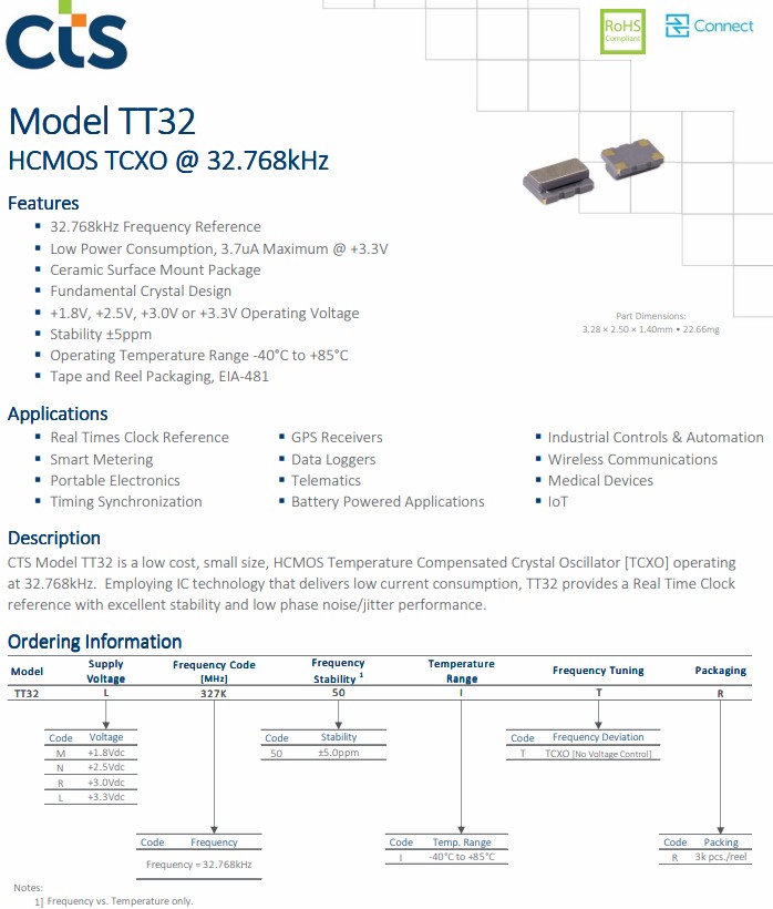 TT32系列HCMOS溫度補償晶體振蕩器,TT32M327K50ITR,時鐘晶振
