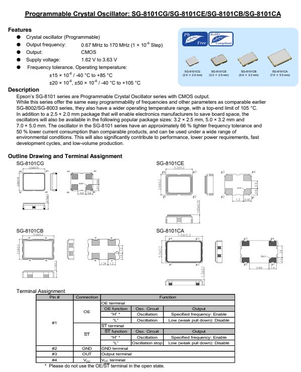 | X1G005191005900 | SG-8101CA | 4.096000 MHz | 7.00 x 5.00 x 1.40 mm | CMOS | 1.620 to 3.630 V | -40 to 85 °C |