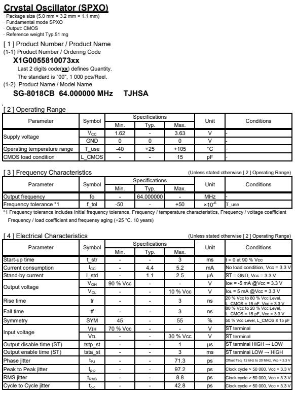 | X1G005581007300 | SG-8018CB | 64.000000 MHz | 5.00 x 3.20 x 1.30 mm | CMOS | 1.620 to 3.630 V | -40 to 105 °C | +/-50 ppm |