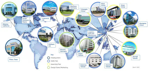 Diodes 公司總部及美洲銷售辦公室位于美國德州普拉諾 (Plano) 與加州米爾皮塔斯 (Milpitas)。設(shè)計、營銷與工程中心位于普拉諾、米爾皮塔斯、臺北、桃園、竹北、上海、揚州、英國奧爾德姆及德國紐豪斯 。Diodes 的晶圓生產(chǎn)設(shè)施位于美國緬因州南波特蘭;英國格林諾克奧爾德姆;中國上海和無錫;還有基隆和新竹。Diodes 在中國上海、濟(jì)南、成都、無錫、中壢和基隆以及德國紐豪斯設(shè)有組裝與測試設(shè)施。另外在多個據(jù)點設(shè)有工程、銷售、倉儲及物流辦公室,包括臺北、香港、上海、深圳、武漢、揚州;英國奧爾德姆;南韓城南市以及德國慕尼黑、法蘭克福,并于世界各地設(shè)有支持辦公室。