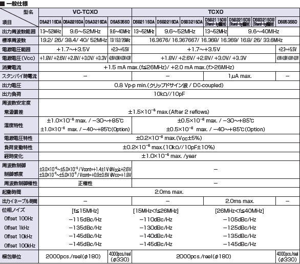 具有最適合于GPS用途的高穩定的頻率溫度特性。 為對應低電源電壓的產品。(DC+1.8V ± 0.1V to +2.9V ± 0.1V 対応可能) 高度:最高0.8 mm、體積:0.0022 cm3、重量:0.008 g,超小型、輕型。 低消耗電流、表面貼片...