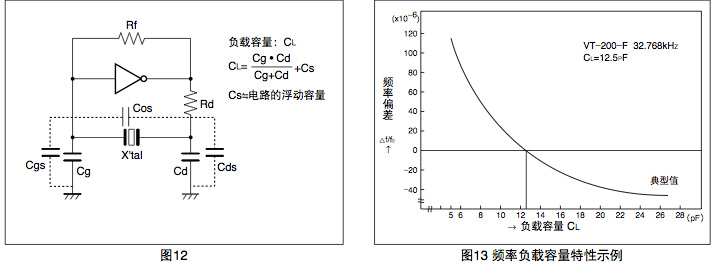 負(fù)載容量 (CL) 是用來(lái)決定在振蕩電路中晶振頻率的參數(shù),從加在振蕩電路中晶振兩端的電容可知負(fù)載容量(參閱圖12). 因振蕩電路的負(fù)載容量的不同,晶振的頻率會(huì)相應(yīng)地產(chǎn)生變動(dòng).為了獲得目標(biāo)的頻率精度,必須使晶振與負(fù)載容量相匹 配.在使用時(shí),請(qǐng)根據(jù)相應(yīng)晶振的負(fù)載容量,將振蕩電路的負(fù)載容量設(shè)定為與其相符.