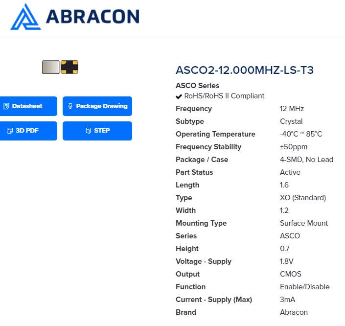 | ASVMPC-12.000MHZ-LR-T | Abracon晶振 | Pure Silicon™ ASVMP | MEMS (Silicon) | 12MHz | 2.25 V ~ 3.6 V | -40°C ~ 85°C |