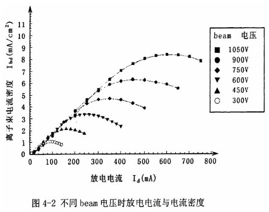 圖4-2表示的是在不同的beam電壓下,隨著放電電流的變化,進(jìn)口晶振的電極膜處(與離子槍加速鉬片的距離為25mm)所測(cè)得的電流密度。從圖中可以知道,對(duì)于不同的beam電壓,放電電流變化時(shí),都有相對(duì)應(yīng)的放電電流使得電流密度達(dá)到最大。本文說(shuō)所的離子刻蝕頻率微調(diào)就是采用了各不同beam電壓時(shí)的最大電流密度進(jìn)行的。當(dāng)設(shè)定好調(diào)整速度后,根據(jù)計(jì)算決定beam電壓,然后根據(jù)該電壓下最大的電流密度計(jì)算出放電電流。