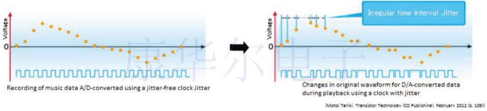 頻率穩(wěn)定性(頻率在延長的時間內(nèi)不會變化的特性)通常被視為晶體振蕩器的重要屬性.但是,音頻設(shè)備需要短期而不是長期的穩(wěn)定性.在這樣的背景下,通常將頻率穩(wěn)定度約為±30~±100ppm的SPXO(*4)用作主時鐘.高端音頻系統(tǒng)可能會配備OCXO(*5)來獲得更高質(zhì)量的聲音.