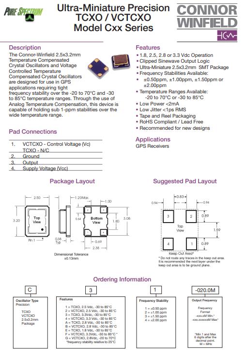 GPS接收器專用溫補晶體振蕩器C34-040.0M,康納·溫菲爾德是一家非常知名的元器件供應商,致力于為廣泛應用市場提供具有競爭優(yōu)勢的產(chǎn)品,通過自身的努力,開發(fā)一系列優(yōu)質的有源晶振產(chǎn)品,并得到廣大用戶的認可,編碼C34-040.0M,Connor-Winfield 3.2x2.5mm溫補晶體振蕩器和電壓控制溫度補償晶體振蕩器是為GPS設計,需要緊密配合的應用,頻率穩(wěn)定性在-20至70°C和-30至85°C的溫度范圍。通過使用模擬溫度補償,本裝置是能夠保持低于1ppm的穩(wěn)定性寬溫度范圍。產(chǎn)品主要應用GPS接收器。
